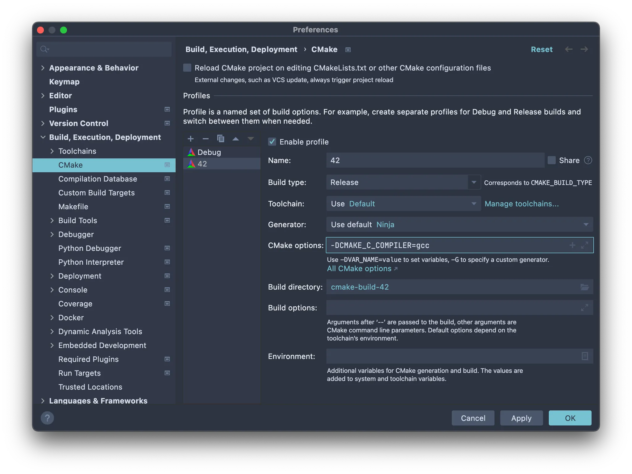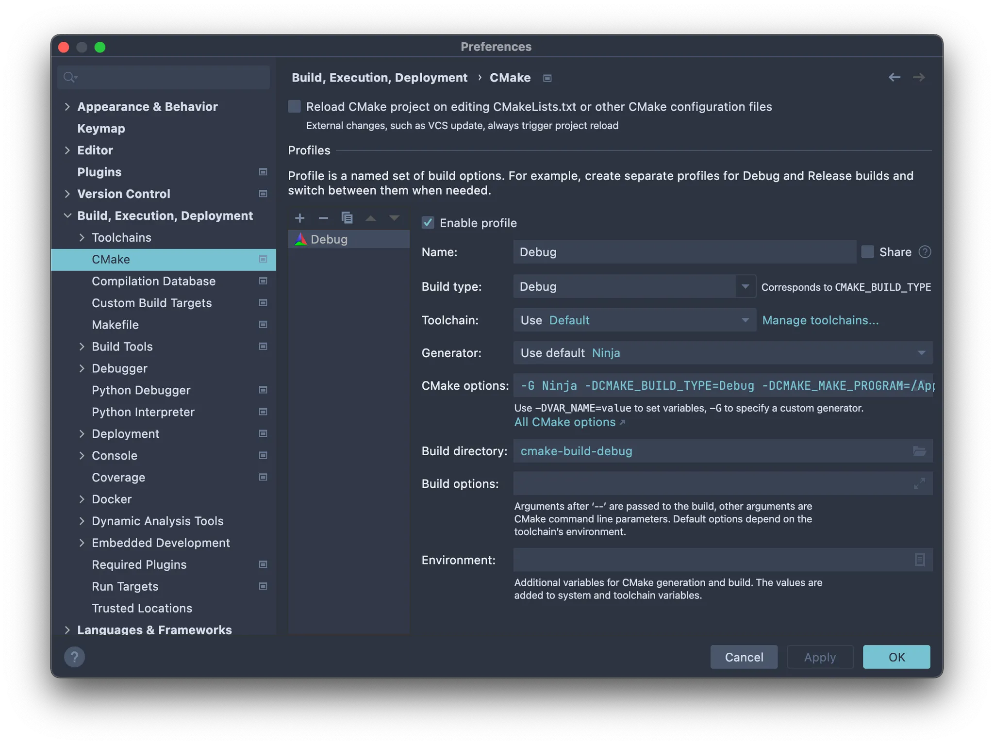 Build, Execution, Deployment → CMake를 찾아 이동하시면 이런 화면이 나옵니다.
