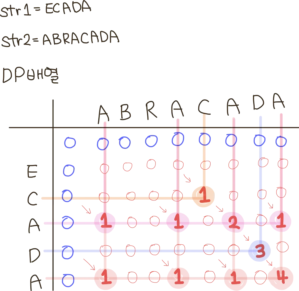 이중 for문을 돌다가 같은 문자를 만나게 되면 그전까지의 공통 부분 문자열 길이 + 1을 저장한다