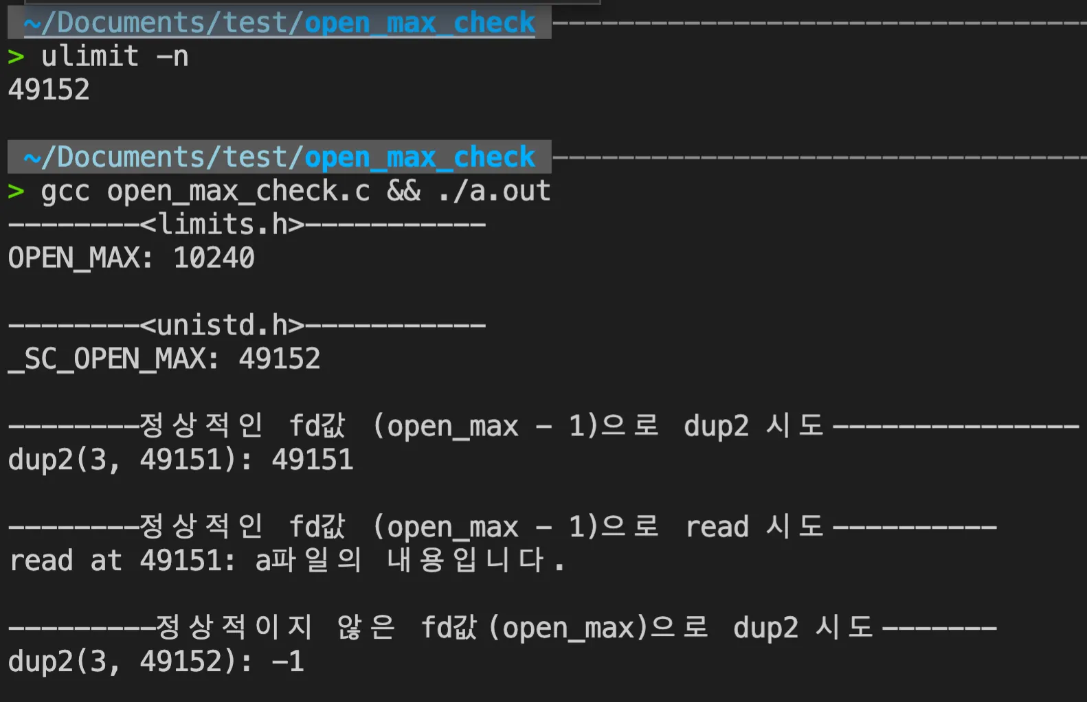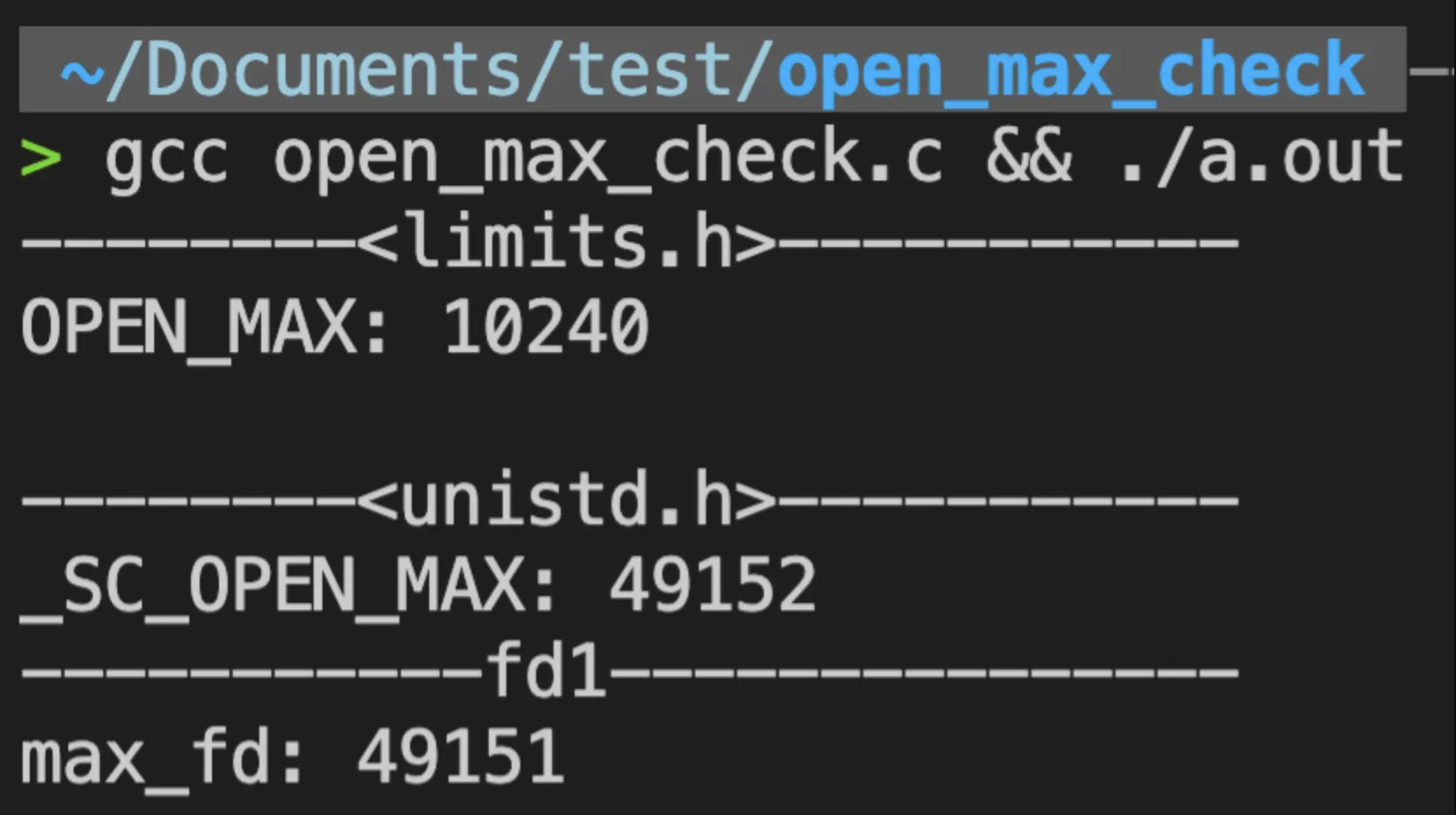 앞서 클러스터의 Mac 환경에서는 4만개 이상의 fd가 열림을 확인했습니다. 또한 작동 환경에 따라서 변화하는 값에 의존하는것은 잘 못된 선택이라고 봅니다. 그리고 파일을 OPEN_MAX까지 직접 open하지 않더라도 dup2()를 통해 fd값을 높게 설정하는 것은 아주 쉽게 가능합니다. (pipex를 선택하시면, 사용할 함수입니다.)