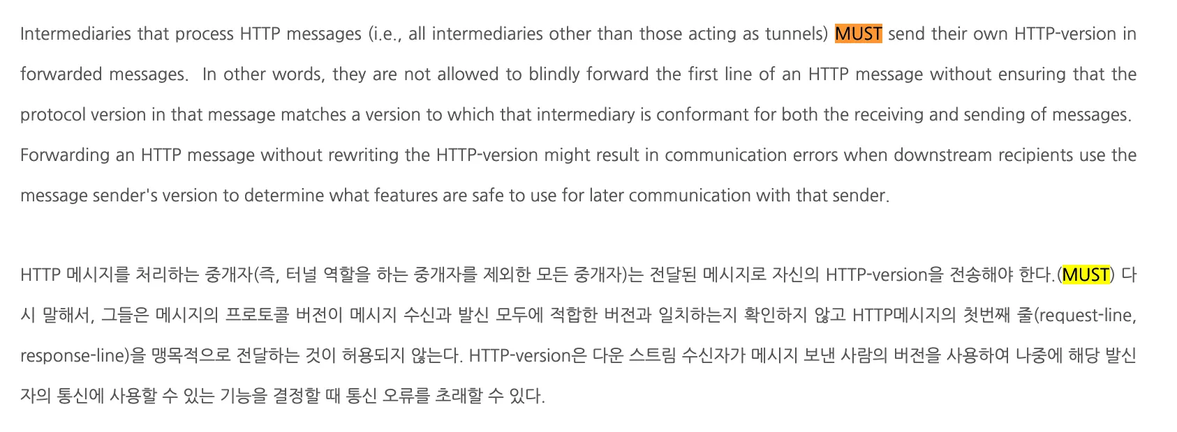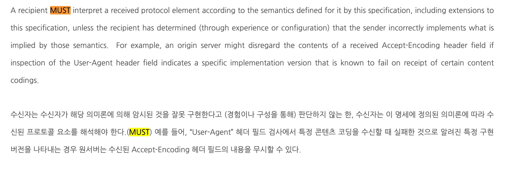 수신자는 반드시 HTTP 메시지를 US-ASCII [USASCII]의 상위 집합인 인코딩에서 octet로 구문 분석해야 한다.