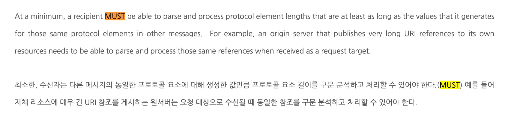 HTTP는 Section 2.5에서 설명한 것처럼 request-line의 길이에 대해 미리 정의된 제한을 두지 않는다. 구현한 것보다 더 긴 메서드를 수신한 서버는 501(Not Implemented)상태 코드로 응답해야 한다.(SHOULD) request-target을 구문 분석하려는 URI보다 긴 414(URI Too Long)상태 코드로 응답해야 한다.(MUST) ([RFC95231]의 Section 6.5.12 참조)