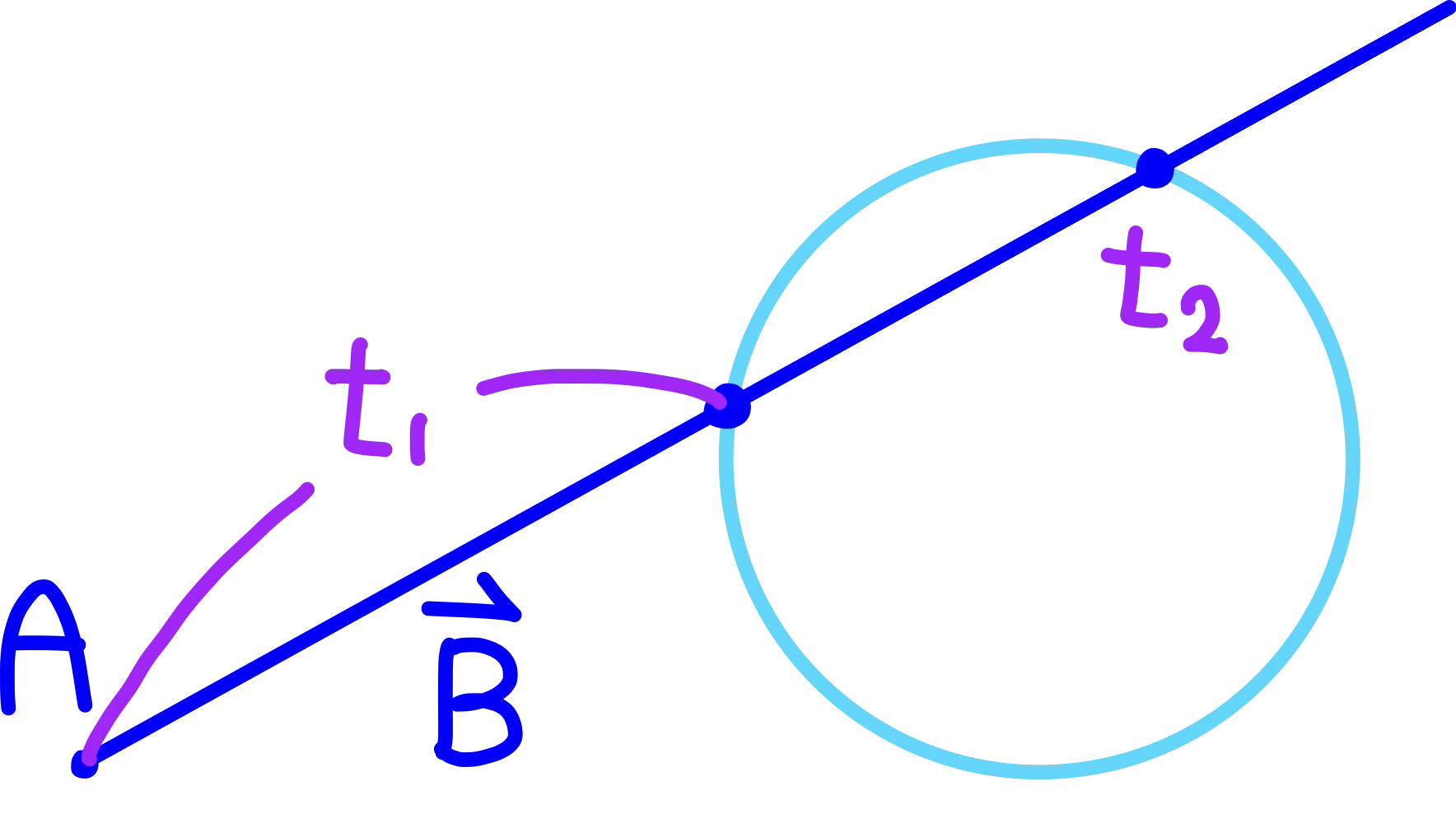 아래 그림처럼 우리가 정점 A에서 ray를 쏜다고 생각해보자. 이때 좌표상의 구에 우리가 쏜 ray와 부딪힌 지점들이 있을 것이다! 이때 t의 값은 바로 부딪힌 지점과 정점 A사이의 크기이다.