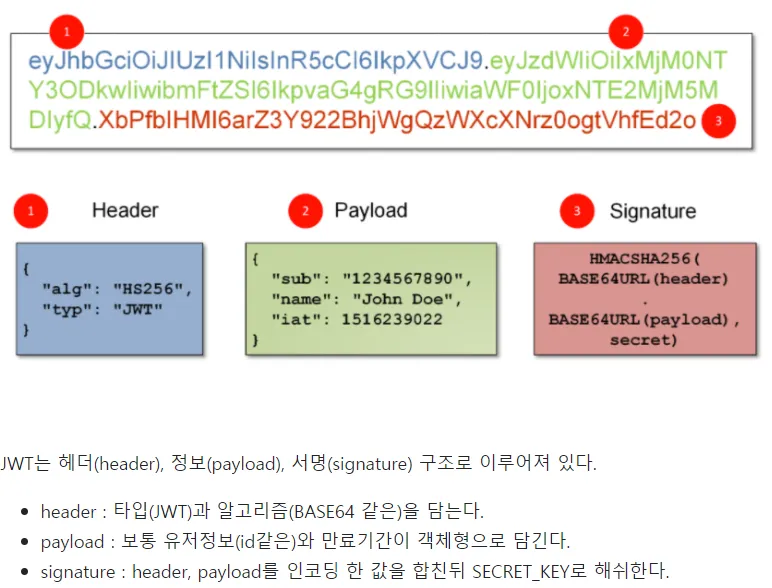 (이 토큰안에는 넣고 싶은 정보를 모두 넣을 수 있는데 이 토큰이 클라이언트에게 보내지기 때문에 탈취 당할 위험이 있으므로 비밀번호와 같은 중요 정보는 넣지 않아야한다.)