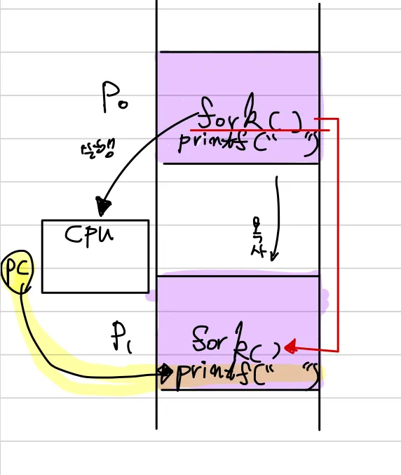 위의 실행 파일이 메모리에 로드된 프로세스가 P0라고 할때, P0가 CPU를 점유한 상태에서 pid = fork() 명령어를 실행하면, 현재 상태의 P0와 동일한 P1이 메모리에 복사된다.(현재 PCB 상태도 그대로 복사) 복사 이후, 그 다음 줄인 printf()가 실행되고 나면 P0를 할당 해제 되는데, PC는 P1의 PCB를 받아, fork()명령어 이후인 printf()문을 실행하게 되어, 위의 소스 코드 main.c를 컴파일 하여 실행해보면