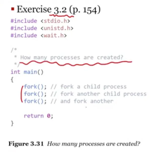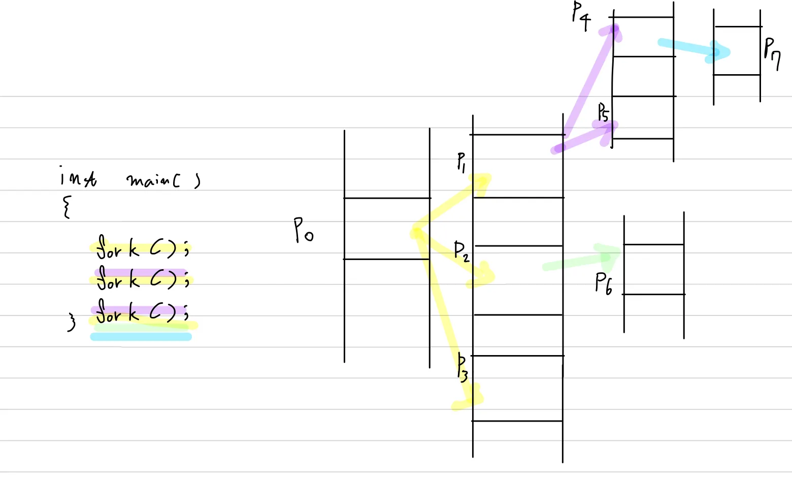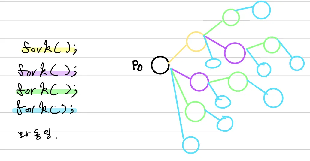 각 명령어가 위 처럼 부모 프로세스로부터 자식 프로세스들을 만들어내고, 이는 2^4개의 프로세스를 만들어낸다.