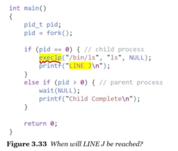현재 위의 코드에서 execlp를 호출해서 ls라는 프로그램(커맨드)를 자식 프로세스에 복사한다. → ls가 실행된다. printf(”LINE J\n”);는 실행되지 않는다. 덮어씌워졌으므로.