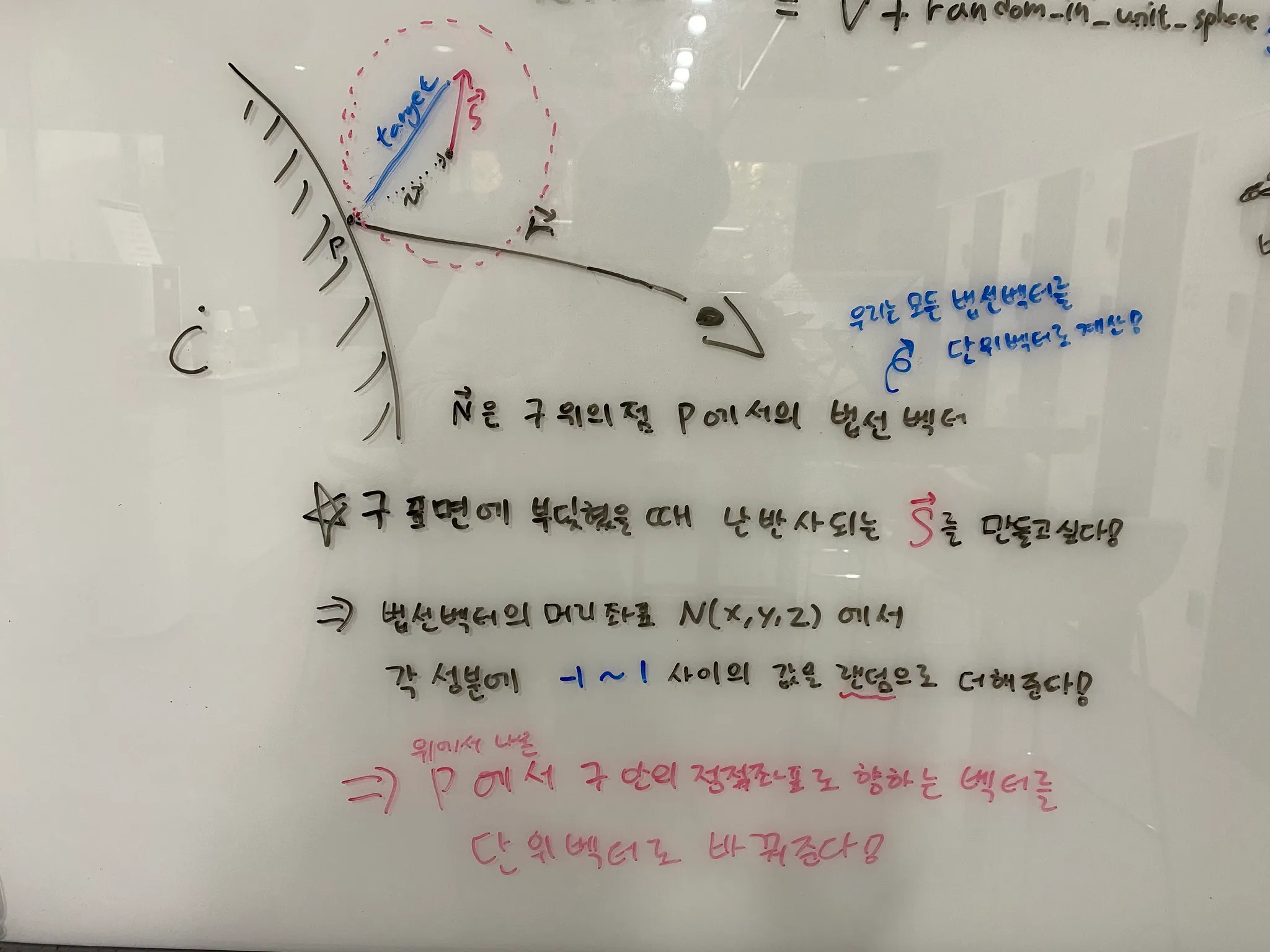 우리는 점P 에서 랜덤하게 반사되는 target벡터를 구해야하는데 그 벡터가 부딪히는 구 내부를 향하게 된다면 반사의 의미가 없게 되는 것이다. 이때 우리는 또 내적을 활용해서 이 문제를 쉽게 해결할 수 있다. 이전에 내적을 활용하는 것을 배웠기 때문에 쉽게 이해할 수 있을 것이다!