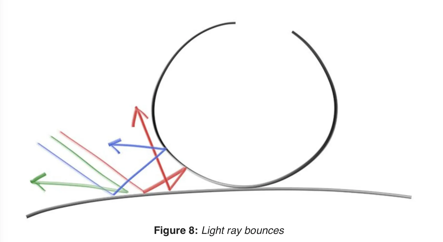 여기서 추가적으로 이러한 재질의 표면은 빛을 완전히 반사하는 것이 아니라 일정부분 흡수하게 된다. 즉 반사가 계속 이루어질수록 흡수되는 빛의 양이 많아져서 점점 빛이 어두워지게 된다.