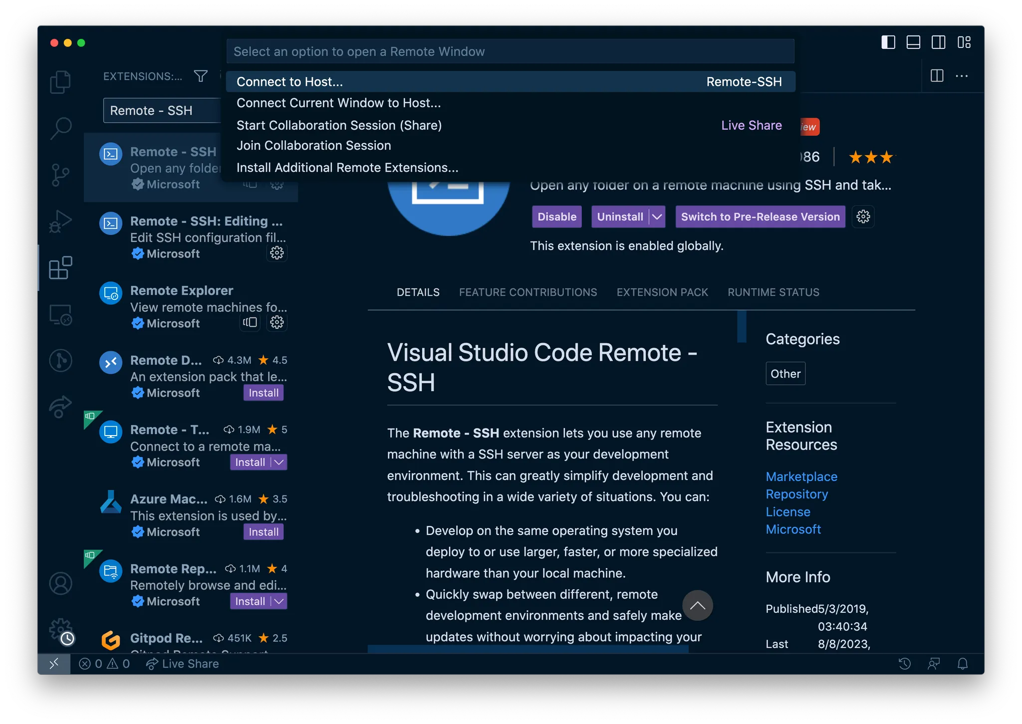 설치하면 왼쪽 아래에 remote 버튼이 생기는데, remote 버튼을 누른 후 Connect to Host를 선택합니다.
