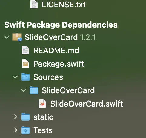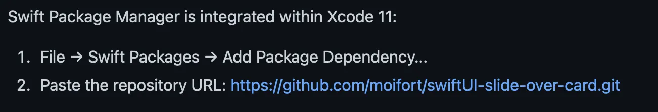패키지에서 제공하는 Readme에 링크가 적혀있을 것이다. 이번에 사용할 Slide Over Card for SwiftUI 패키지에도 아래와 같이 친절하게 적혀있다.