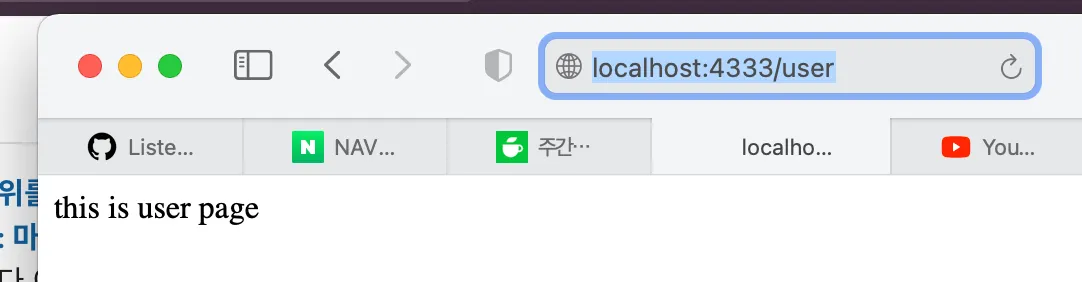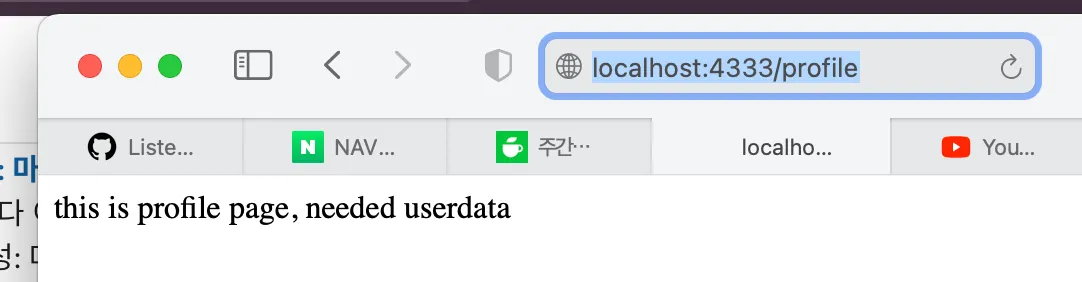 이렇게 하면 아래와 같이 '/' , '/user' , '/profile' 에서 각각 get 요청을 보낼 때에 각기 다른 메세지를 보실 수 있습니다.