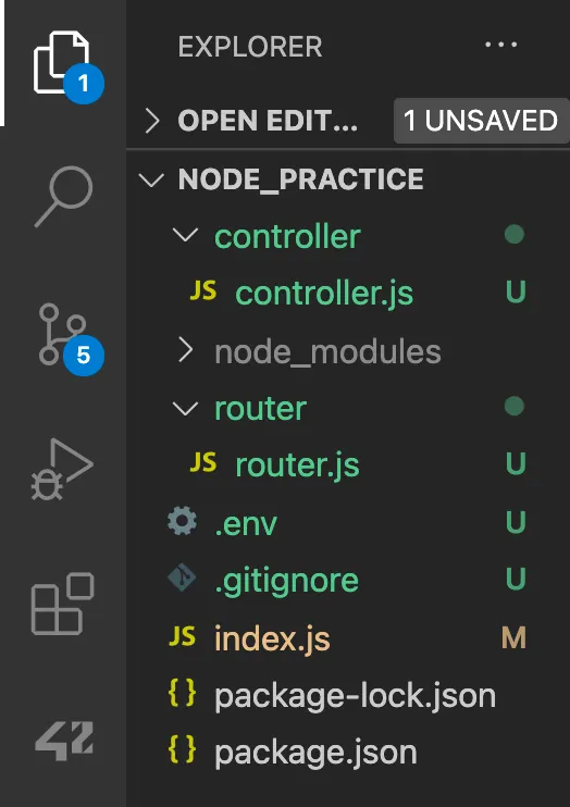 일단 라우터를 만들기 전에 각자의 역할에 따라 구조를 구분하여 만들어봅시다. 이미 있던 app.js 을 포함해서, 들어오는 url에 따라 요청을 분기해서 처리하는 함수로 보내어줄 라우터를 위해 router 폴더를 만들고, 그 안에 router.js 를 만들어서 라우터를 위한 구조를 만들어줍니다. 그리고 우리가 app.get() 함수에서 2번째 인자로 들어온 함수, 즉 요청에 대한 작업을 처리하는 부분을 위해 controller 폴더를 만들고, 그 안에 controller.js 를 만들어서 함수들을 안에 넣어줄 부분을 만들어줍시다.
