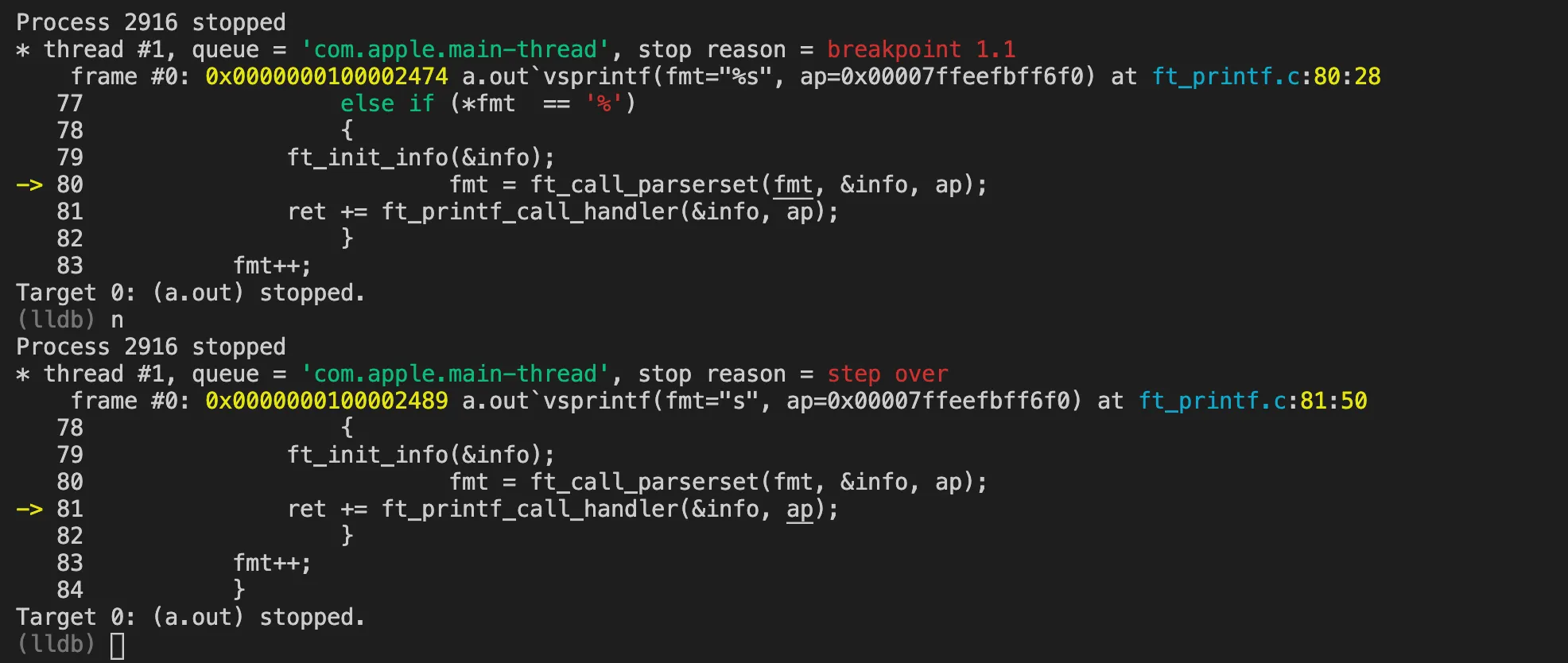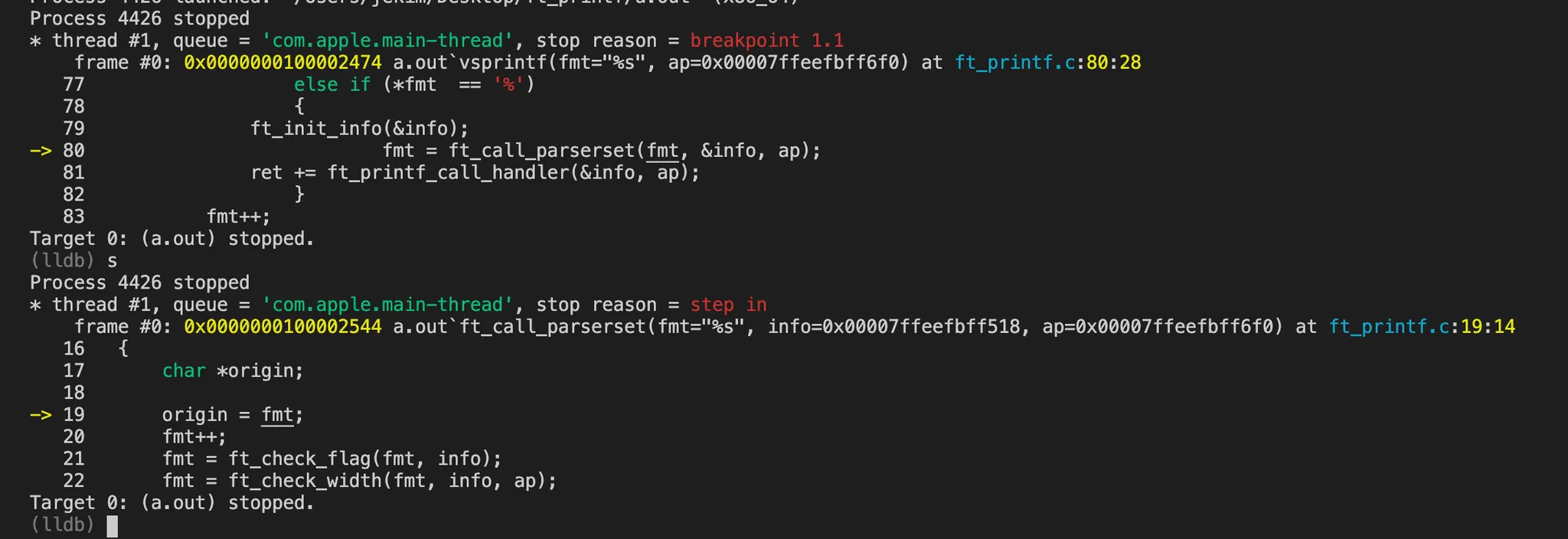 위의 예제에서 보면 80번 라인에서 s 를 입력했더니 해당 라인에 걸려있는 함수로 step into 해서 현재 디버깅 위치가 ft_call_parserset 로 바뀐 것을 볼 수 있다.