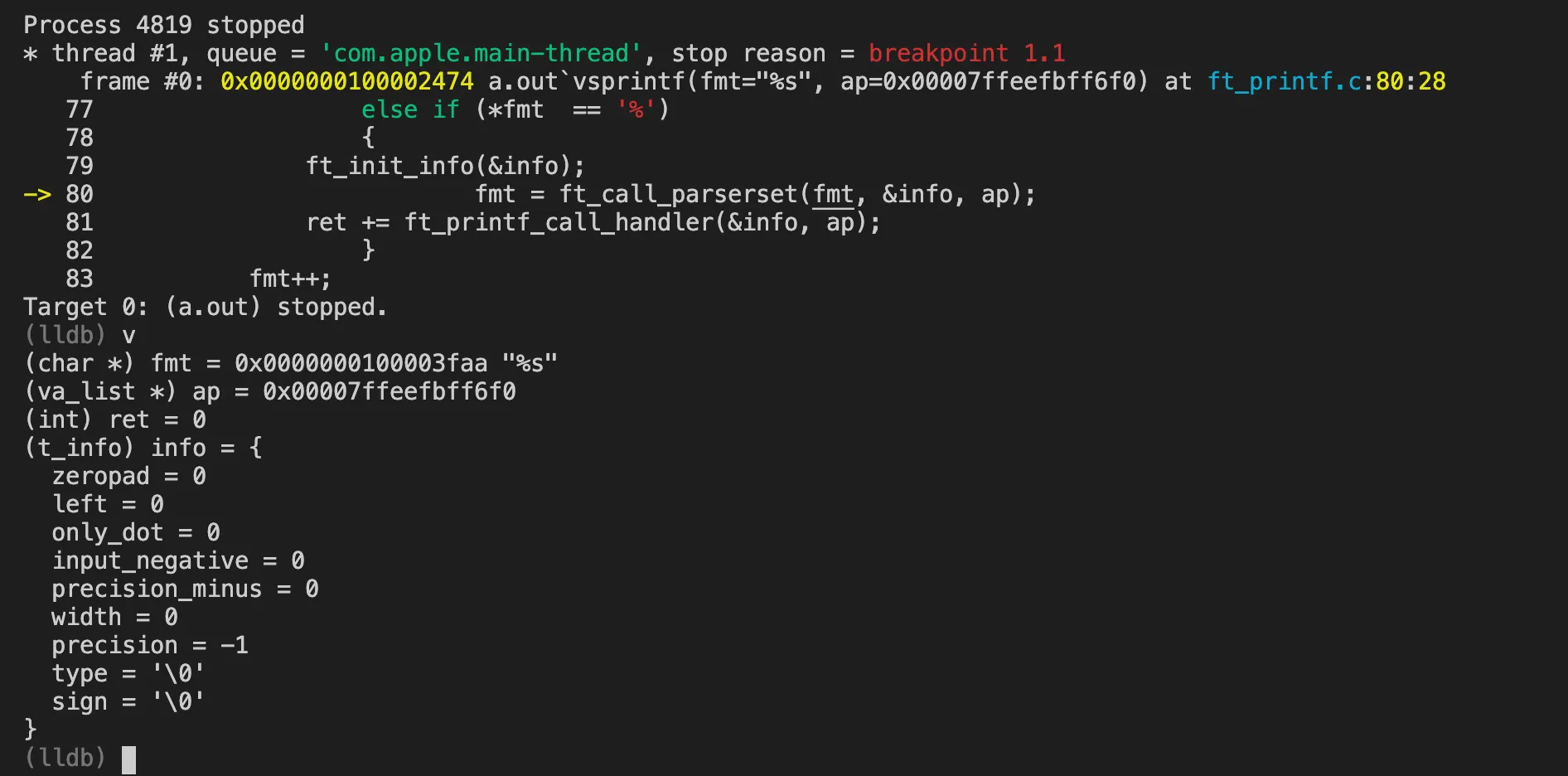이제 나는 구조체 info 에 이 함수가 fmt 를 잘 파싱하여 기록하고 있는지 보고싶다. 그러면 이 구조체에 정보가 기록되기 전 시점에 동작을 멈추고, 기록을 하는 과정과정마다 변수를 확인하면 된다. 그러면 최초로 구조체에 정보가 기록되기 전에 브레이킹 포인트를 설정하면 된다. 그렇다면 80번 라인에 브레이킹 포인트를 걸어 놓으면 된다.