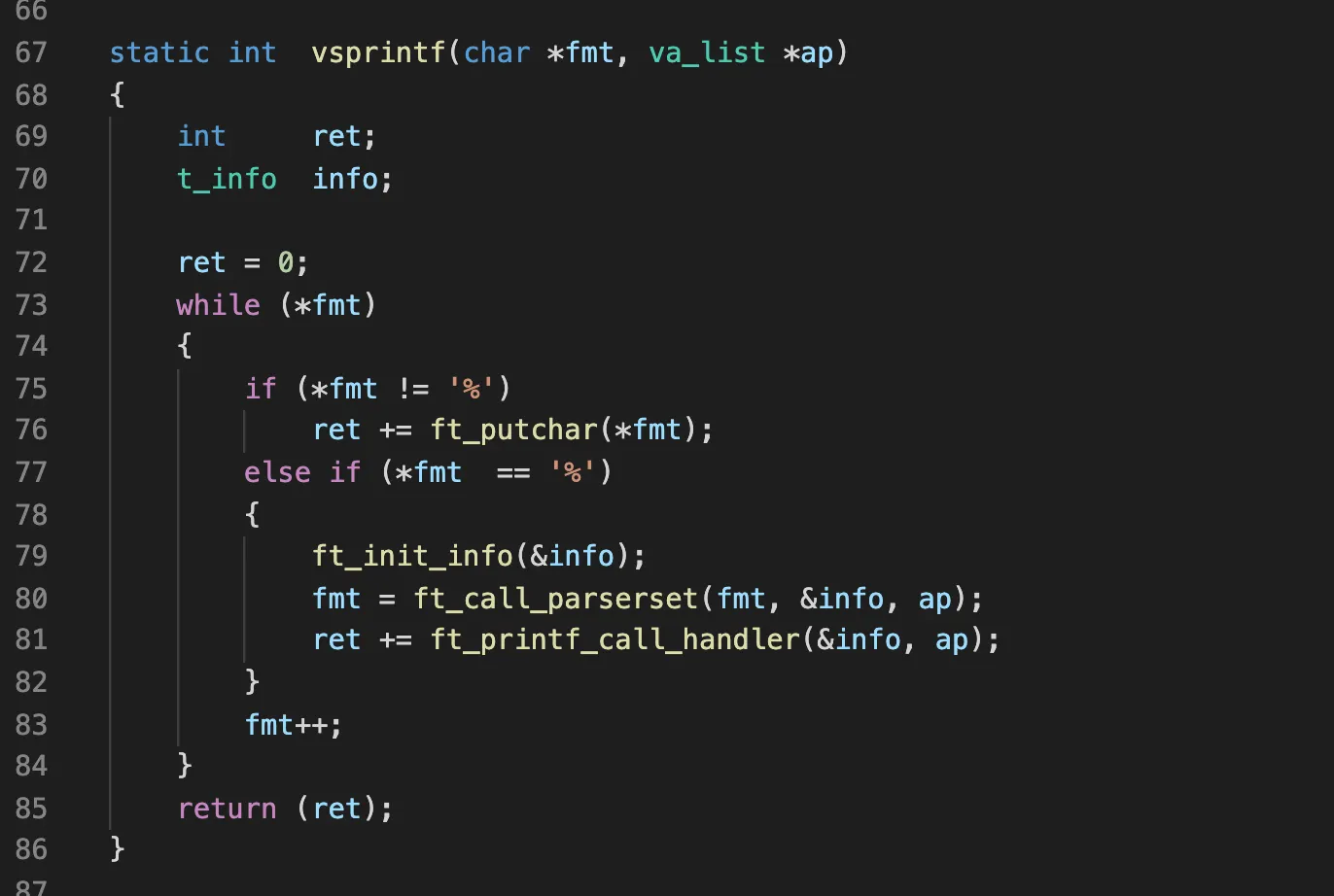 나는 ft_printf.c 파일 안에 위와 같이 파일을 작성했다. 함수 vsprintf는 fmt에서 '%'가 있을 때, 80번 라인에서 ft_call_parserset 를 실행한다. ft_call_parserset 함수는 파싱함수들을 호출해서, 첫번째 매개변수로 들어온 fmt 문자열을 파싱하여 구조체 info에 정보를 기록한다. 그런 뒤에 81번째 라인에서 ft_printf_call_handler를 호출하여 구조체 info 에서 기록된 정보에 따라 출력한다. 그 뒤 해당 함수는 표준출력으로 출력한 문자열의 길이만큼 ret 에 정수를 더해준다. vsprintf 는 이렇게 매개변수 첫번째인 문자열 전체를 출력하여 반환된 ret 을 반환한다.