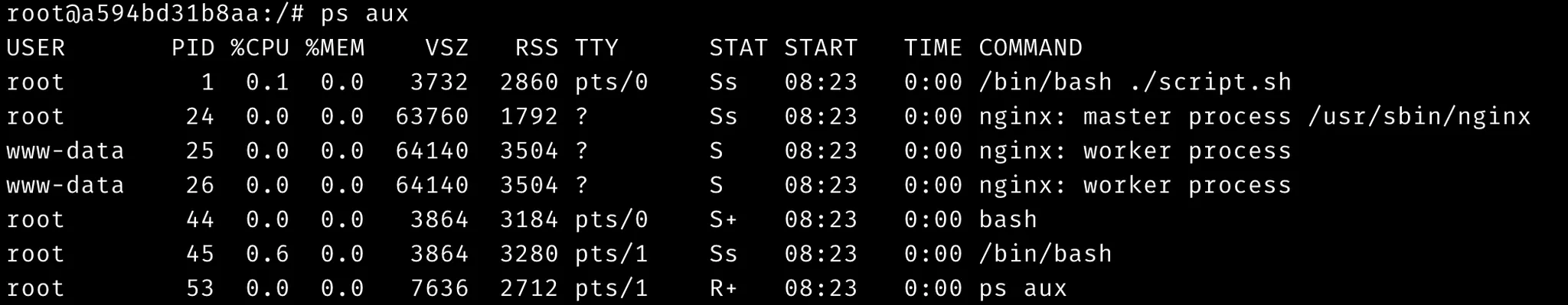현재 pid 1 은 전부 script.sh이 가지고 있음, script.sh에서 bash로 안끝나게 설정해둠.
