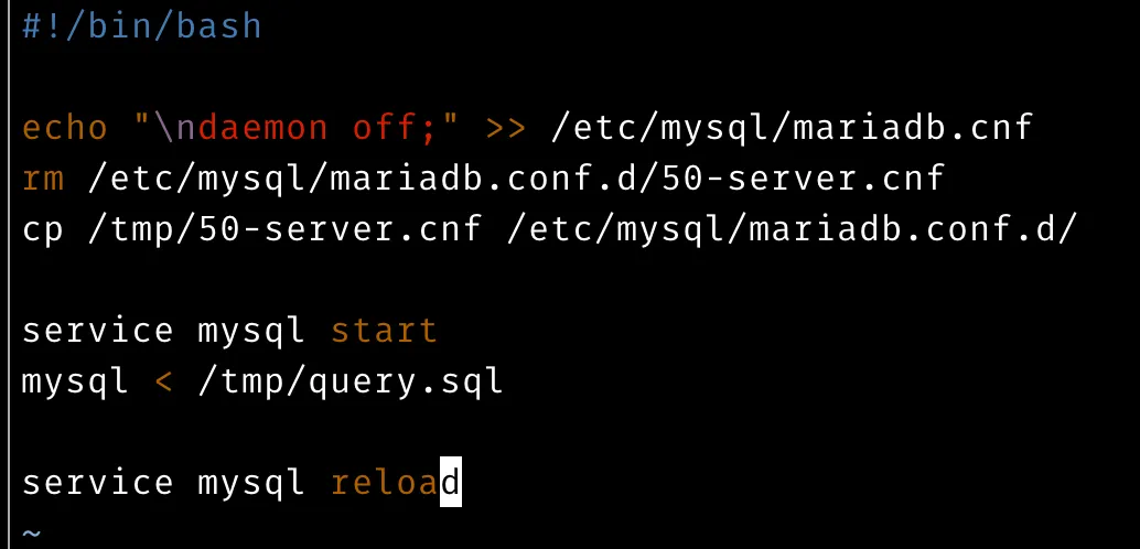 →query.sql로 넣지 않고 그냥 script.sh에 echo 로 sql문 넣었더니 돌아감. 컨테이너에 있는 env가 mysql을 실행하면 접근이 안되는 것 같음. 어떻게 해야 하지….?
