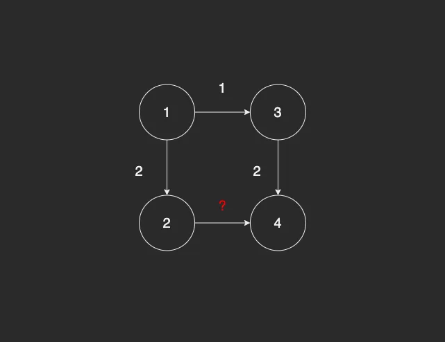 위와 같이 2번 노드에서 4번 노드로 가는 거리를 모른다고 해보자. 그렇다면, 1번 노드에서 4번 노드로 가는 최단 경로가 3번 노드를 거쳐야 하는 것이라는 것을 보장할 수 있을까?