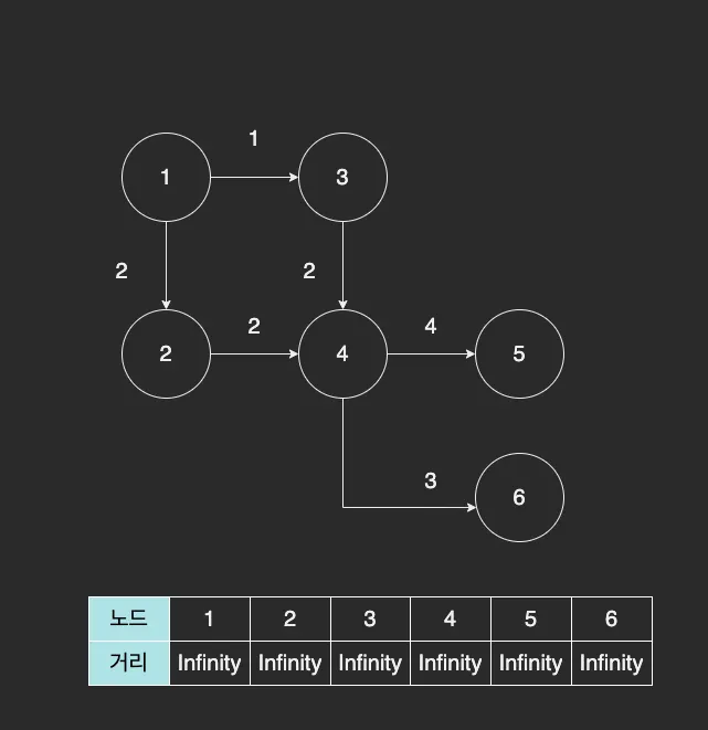 출발 노드는 1번 노드에서 시작한다. 1번 노드는 자기 스스로와 거리가 0 이기 때문에 먼저 0 으로 채워넣는다.