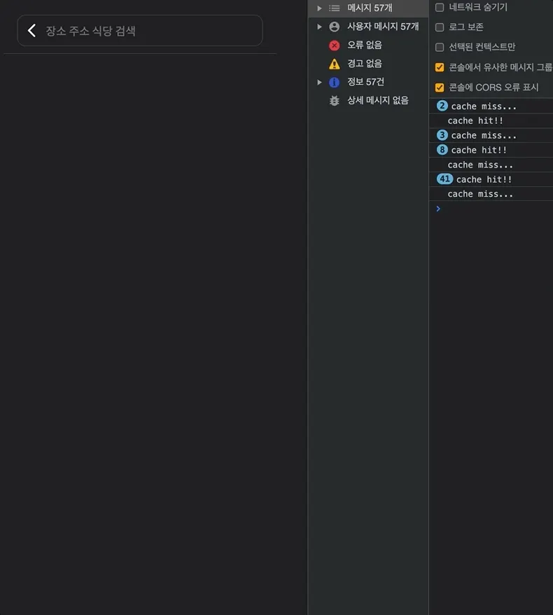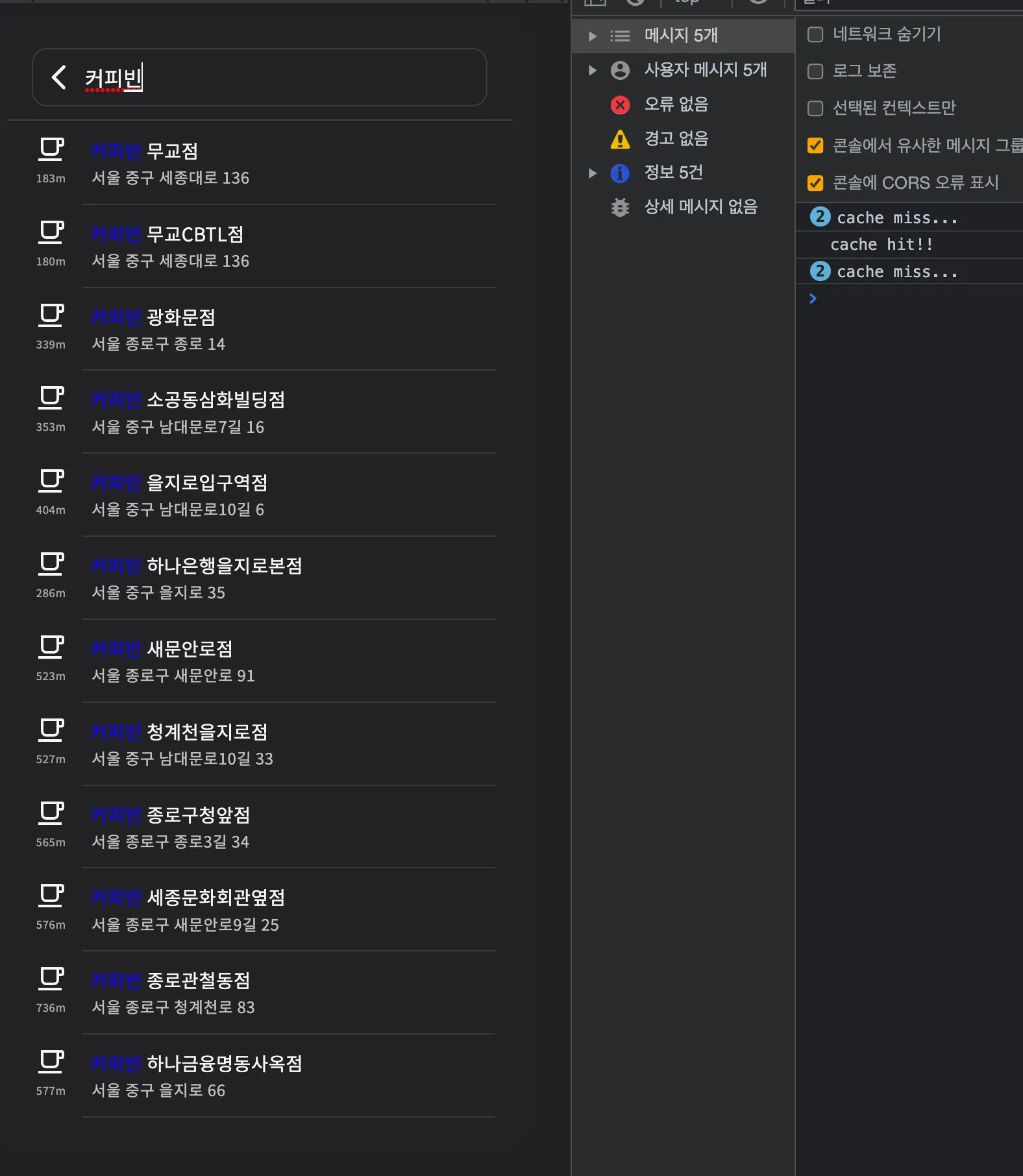 이제 정상적으로 작동하는지 테스트해보자. 아래 사진은 처음 “커피빈”이라는 검색을 한 상황이다. 오른쪽에 cache miss라는 콘솔이 출력되는 것을 볼 수 있다.