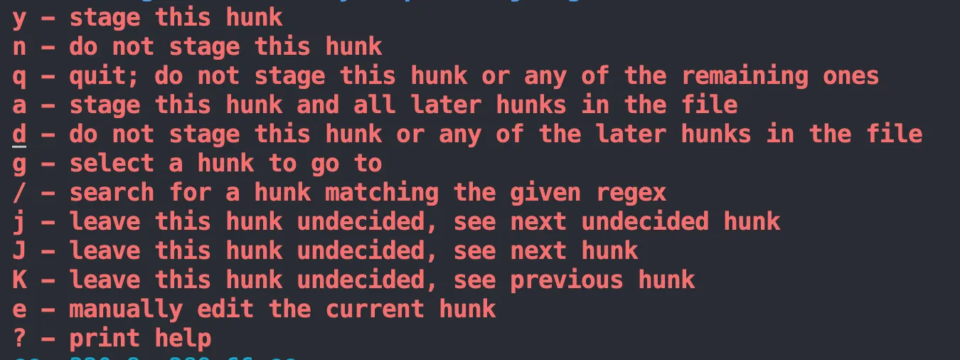 이 때 해당 변경사항을 올리고 싶으면 y(yes), 올리지 않고 건너뛰고 싶으면 n(no), 올리고 싶은 부분을 다 올려 추가로 더 이상 올릴 게 없다면 q(quit)로 나가시면 됩니다.
