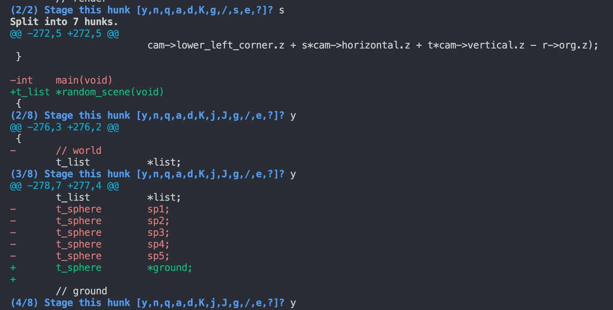 만약 지금처럼 변경사항이 너무 클 때에는 s(split)로 변경사항을 더 쪼갤 수 있습니다.