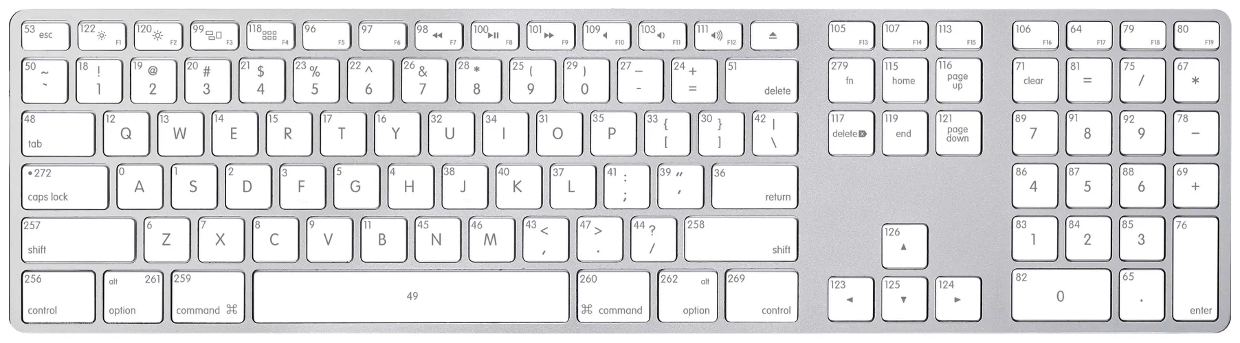 아래는 mac키보드의 keycode 표이다. 확대해서 보면 각 key 왼쪽위에 숫자가 적혀있다! 우리가 원하는 esc의 code 는 53이다.