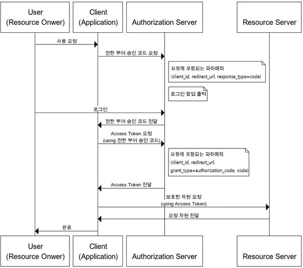 여기서 User는 서비스 사용자(브라우저, 클라이언트)이고, Client는 서비스 서버(백엔드)라고 생각하면 될 것 같다. OAuth 2.0의 구조 자체가 해당 API를 제공하는 기관이 인증 서버와 리소스 서버를 구분하기 때문에, 위 네 개의 주체가 있는 것이다. 인증하는 방식은 다음 순서와 같다.