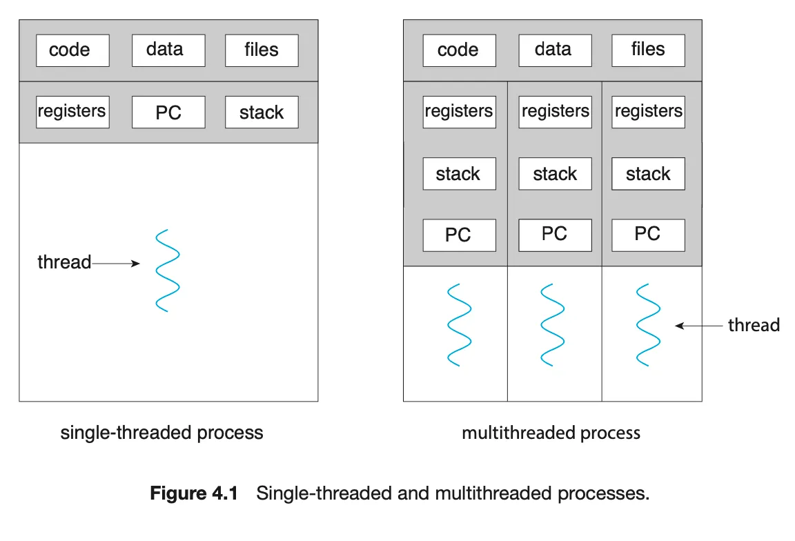 프로세스가 운영체제의 스케쥴링 단위라면, 스레드는 처리 단위이다.(= CPU 이용의 기본 단위) 스레드는 스레드 ID, PC, 레지스터 모음, 그리고 스택으로 구성된다.