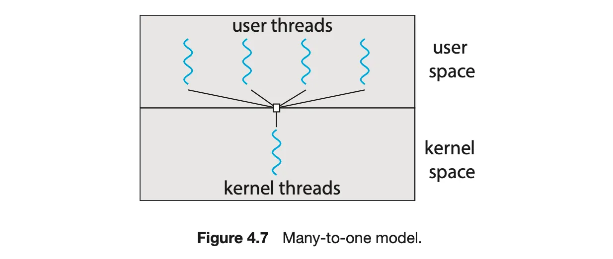 다대일 모델은 다수의 유저 스레드를 한 개의 커널 스레드에 매핑한다.