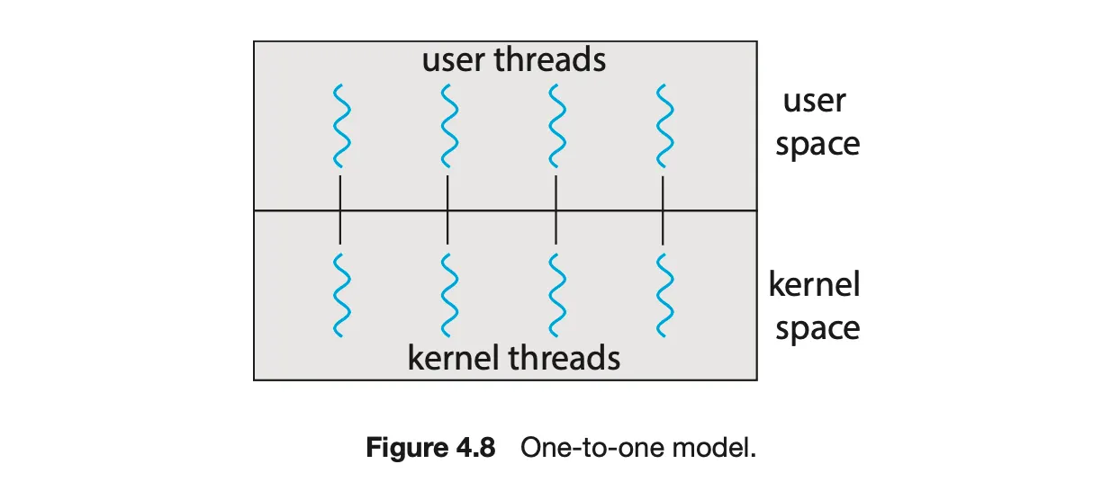 일대일 모델은 각 사용자 스레드를 각각의 커널 스레드로 매핑한다.