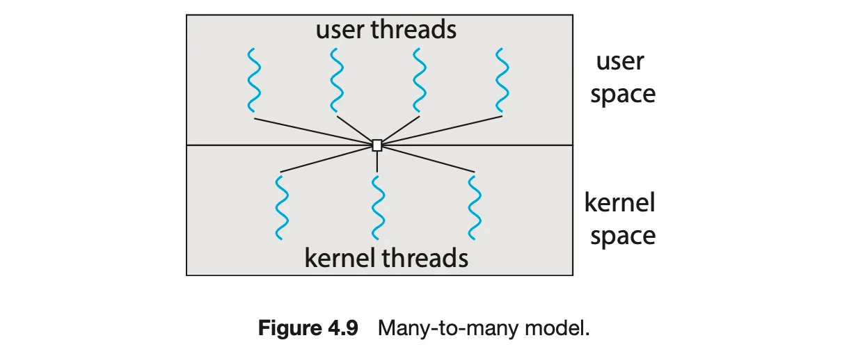 다대다 모델은 여러 개의 사용자 스레드를 같은 수 또는 그 보다 작은 수의 커널 스레드로 매핑한다.