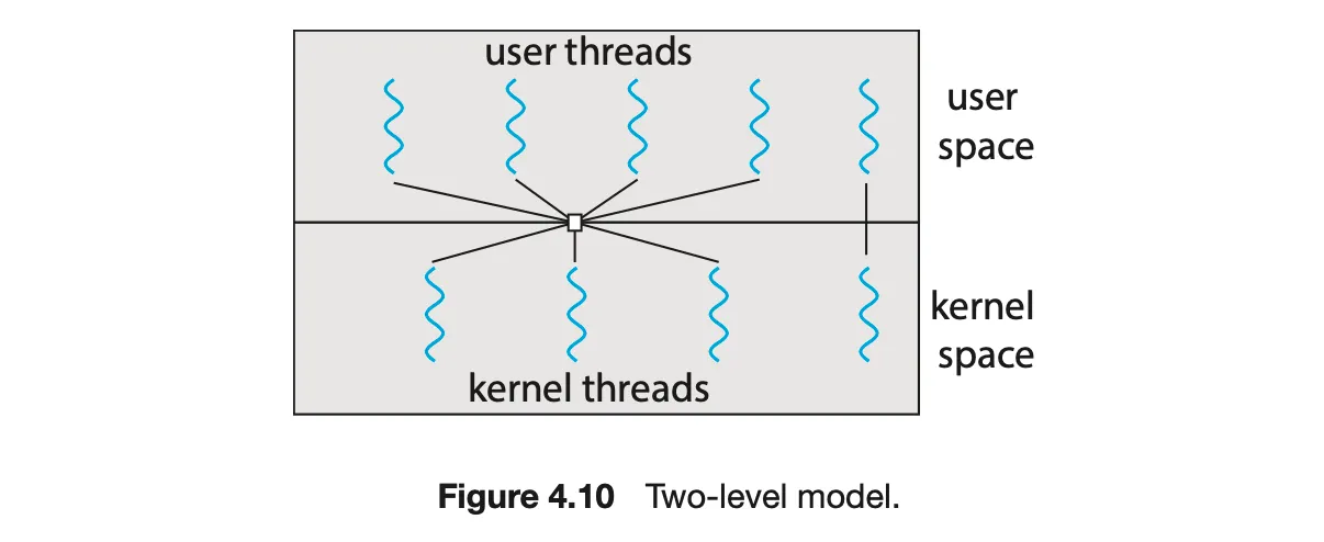 다대다 모델은 많은 논의가 있었지만, 그 중 두 수준 모델이라고 불리는 모델이 가장 융통성 있는 것으로 보이지만, 실제로 구현하기가 어렵다.