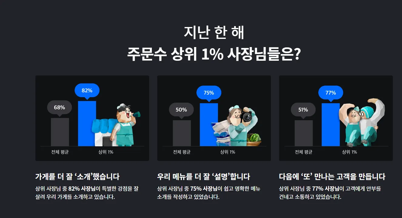 ⇒ 고객이 원하는 것을 플랫폼보다는 다른 방향의 고객인 ‘사장님’이 채워줄 수 있기에, 고객의 니즈를 분석하여 사장님에게 전달하는 방식을 사용.
