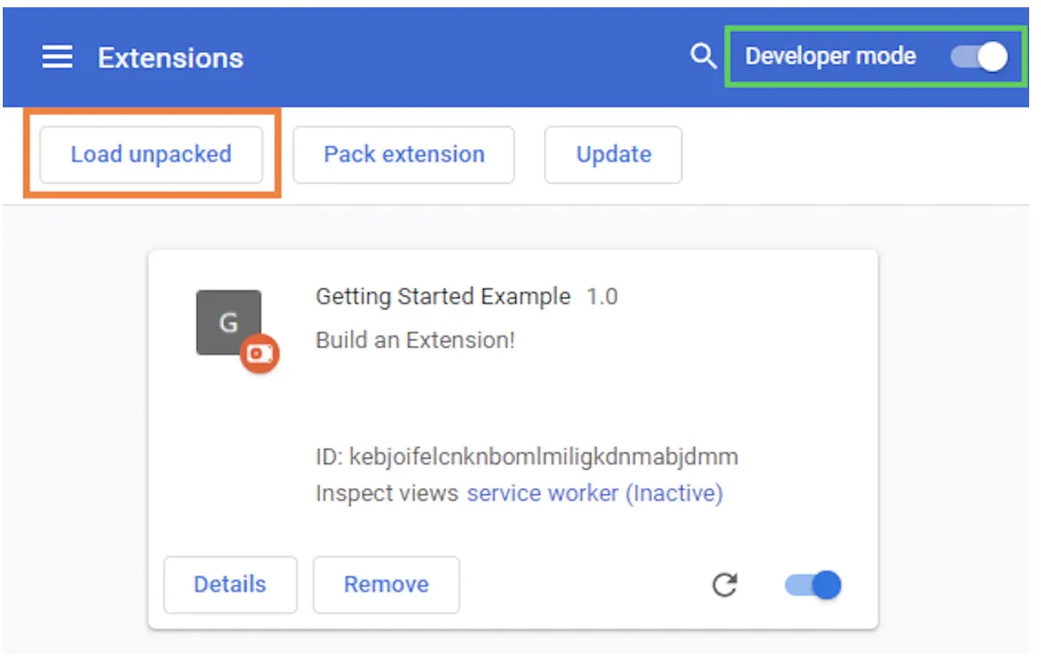 압축해제된 확장프로그램을 로드합니다 혹은 Load unpacked를 클릭(이때, manifest.json 파일이 들어있는 디렉토리를 선택)