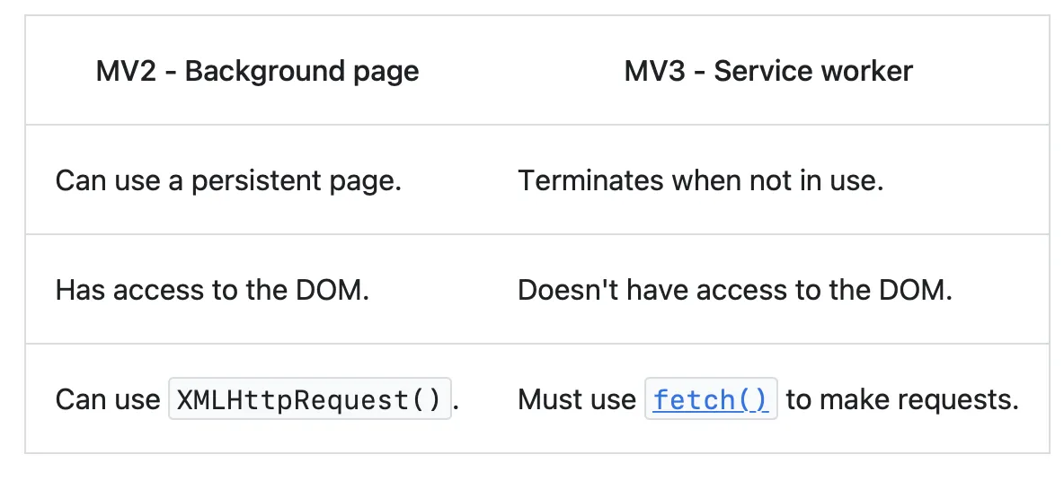Manifest V3에서 Service worker를 사용하도록 변경되면서 바뀐 내용들을 아래와 같이 정리하고 있다.