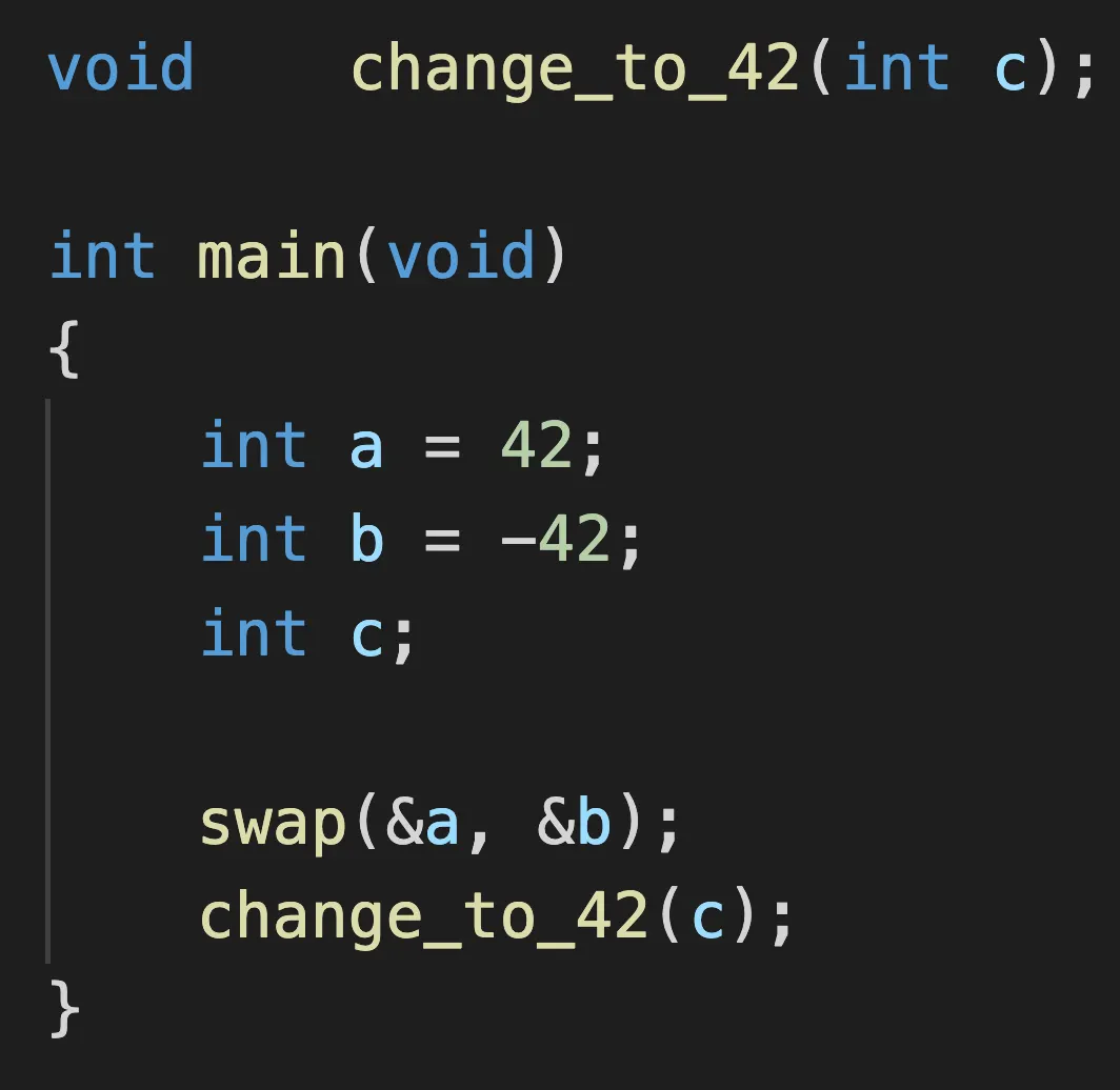 swap 함수를 통해 a와 b의 값을 변경한 것처럼, 파라미터로 넘겨준 c의 값을 42로 변경하는 change_to_42함수를 주어진 프로토타입형태로 구현하실 수 있나요?