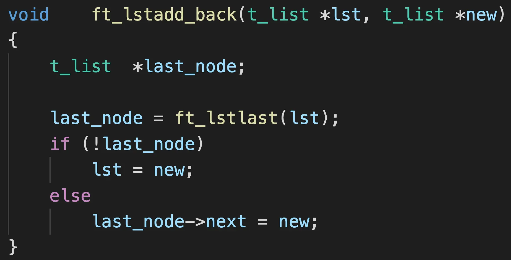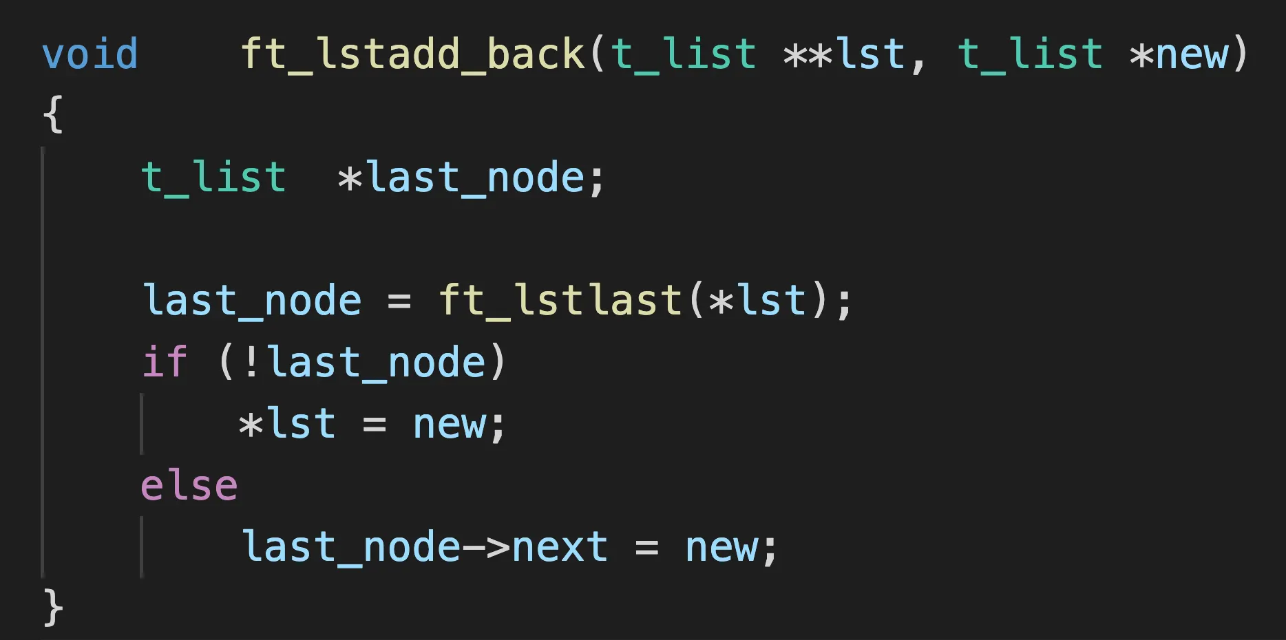 ft_lstadd_back 함수에 대한 필자의 구현은 아래와 같다. 너무 당연한 코드의 형태이다. 여기서 제목에 대한 의문점을 떠올려보자. 파라미터 lst의 타입이 t_list *lst이여도 괜찮을까?