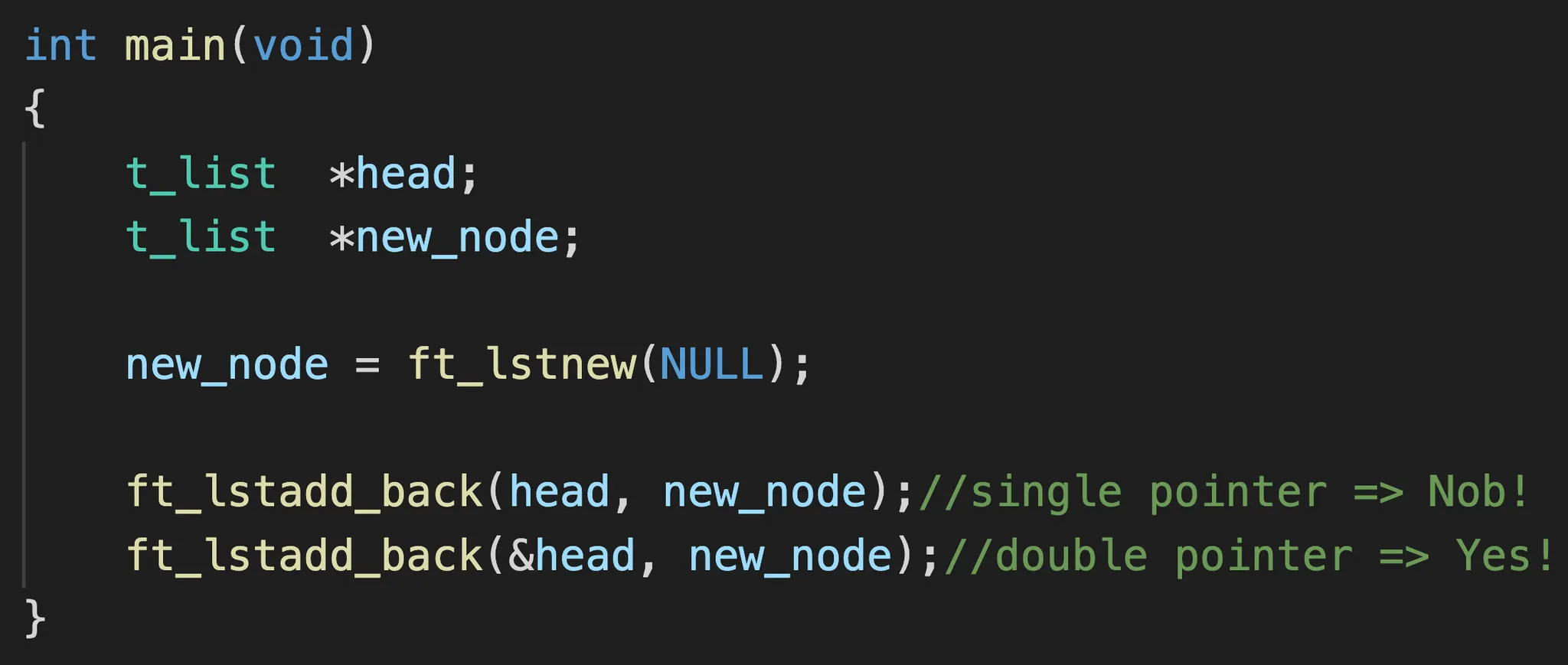 ft_lstadd_back(t_list **lst, t_list *new) 의 경우, t_list **lst 는 main에서 선언된 t_list *head의 주소값입니다. 해당 주소값을 역참조하여 head에 접근하여 데이터를 수정하는 것이 가능합니다.