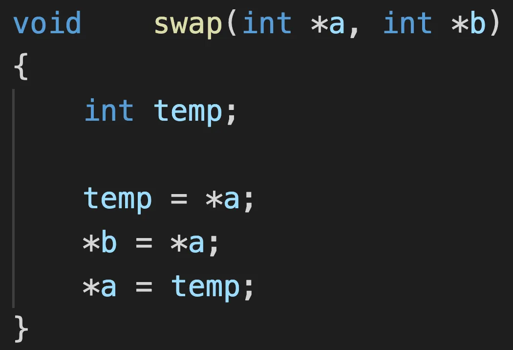 swap 함수는 2 개의 int형 포인터를 받아, 역참조를 통해 a 와 b의 값을 바꾸는 함수입니다.