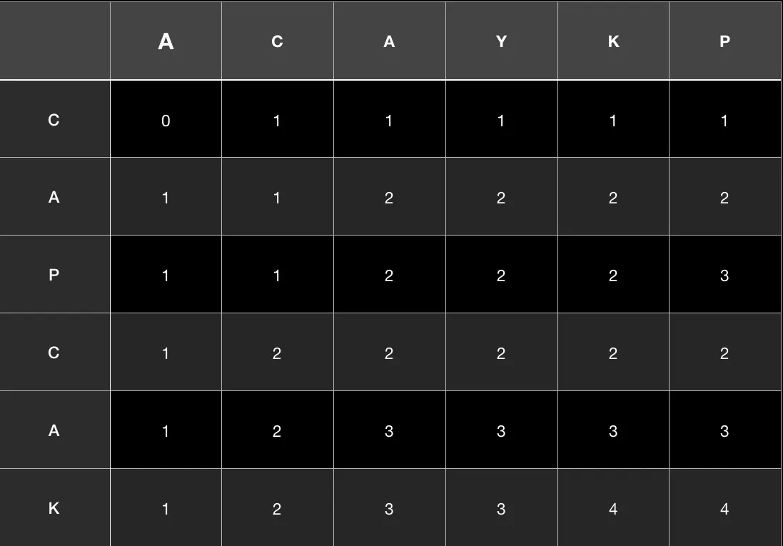우선 1000자를 담을 수 있는 이차원배열을 0으로 초기화 한뒤 문자가 일치할 시에 이전에 일치한 개수에