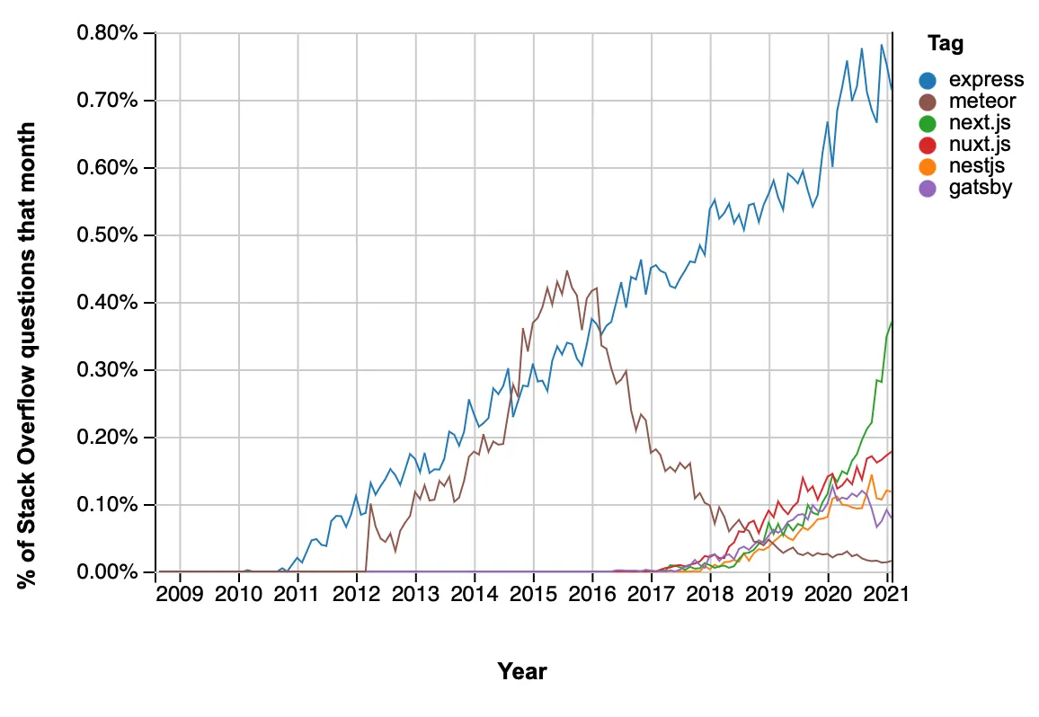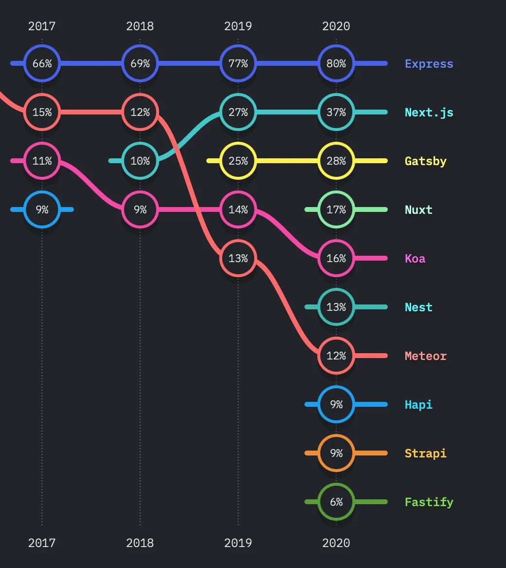 State of JS의 백엔드 프레임워크별 사용량 통계, Express 는 17년도 배포 이후 계속해서 꾸준한 사랑을 받으며 지배적인 툴의 지위를 차지하고 있다. (출처 : State of JS 2020)
