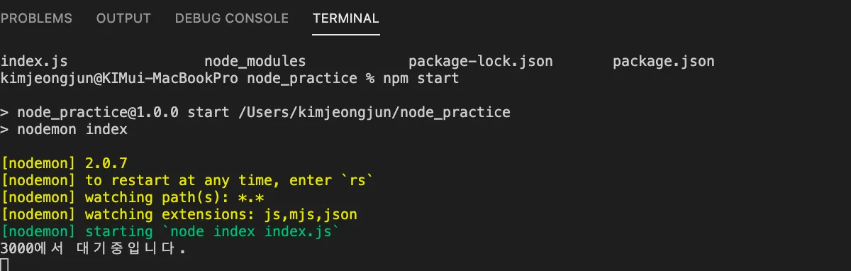 package.json 을 수정합시다. 개발 중 서버코드를 실시간으로 갱신하기 위해서, 서버를 실행할 때에 nodemon 을 이용하여야 하기 때문에 nodemon [file_name] 으로 명령어를 실행해야 합니다. script에 키값을 아래와 같이 추가합시다. 이렇게하면 npm start 라고 콘솔에 입력했을 때 start에 해당하는 명령어인 nodemon index 가 콘솔에 입력되면서 nodemon을 이용하여 서버를 실행할 수 있을 것입니다. 처음에 dependencies 부분이 없어도 놀라지 마세요. package.json 이 있는 파일에 npm i express nodemon 을 잘 하셨다면, 자동으로 추가가 될 겁니다.