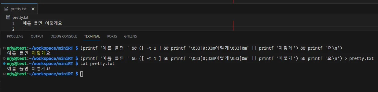 [ -t 1 ]을 통해 문제를 해결한 모습