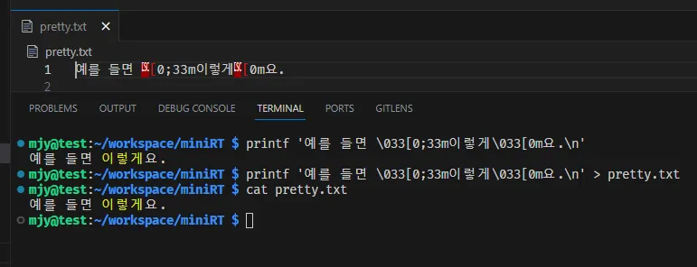 터미널에 뭔가 출력할 때, ANSI Escape Code를 통해 글자나 배경에 색을 입히는 등의 효과를 줄 수 있습니다.