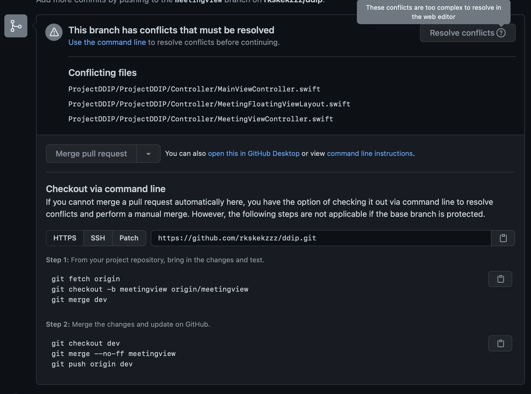 사진을 보면 Resolve conflicts버튼이 막혀 있는 것을 볼 수 있다.