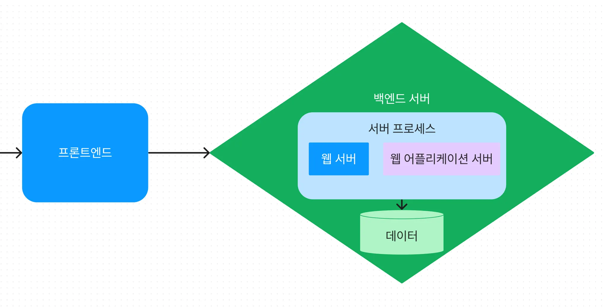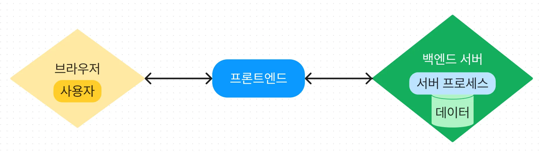 대부분의 웹 서비스라면, 브라우저에서 클라이언트(실제 사용자)가 프론트엔드(자바스크립트)가 보여주는 부분들을 통해 정해진 규약대로(HTTP) 요청을 할 것이고, 서버에서 반환하는 데이터를 받아 사용자가 보는 화면을 재구성할 것입니다. 그리고 이러한 데이터의 흐름과 상호 작용이 실질적으로 서비스가 되는 것 입니다.