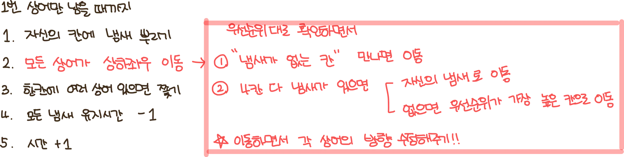 move_shark(i, shark_info[i][X], shark_info[i][Y], shark_info[i][DIRECTION])