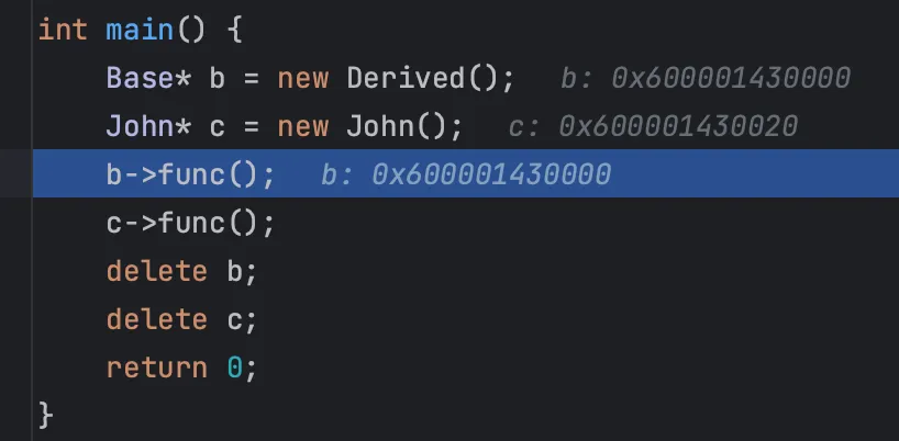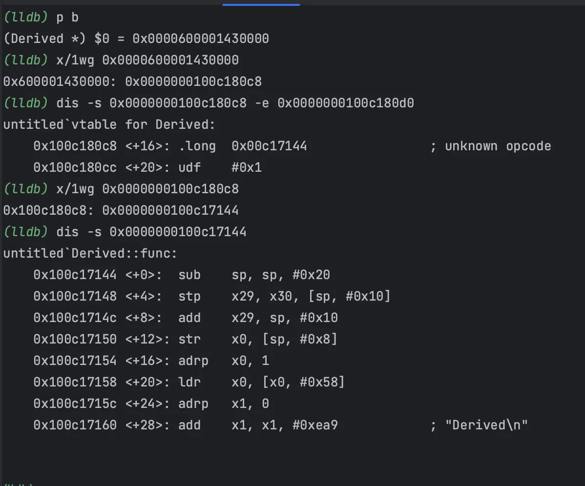 b에 담긴 값인 Derived의 주소를 확인했습니다. 예제에서 b는 0x0000600001430000의 주소를 가집니다.