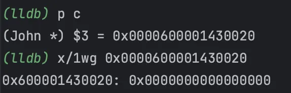 이전에 얻은 주소값의 첫 8byte를 확인합니다. 예제에서는 0x0000000100c180c8의 주소값을 얻을 수 있었습니다.